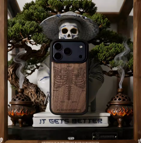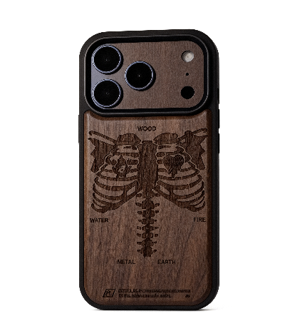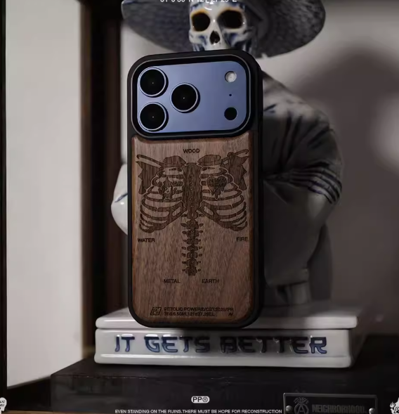 Pouzdro na iPhone odolné proti pádu s reliéfem lebky z ořechového dřeva